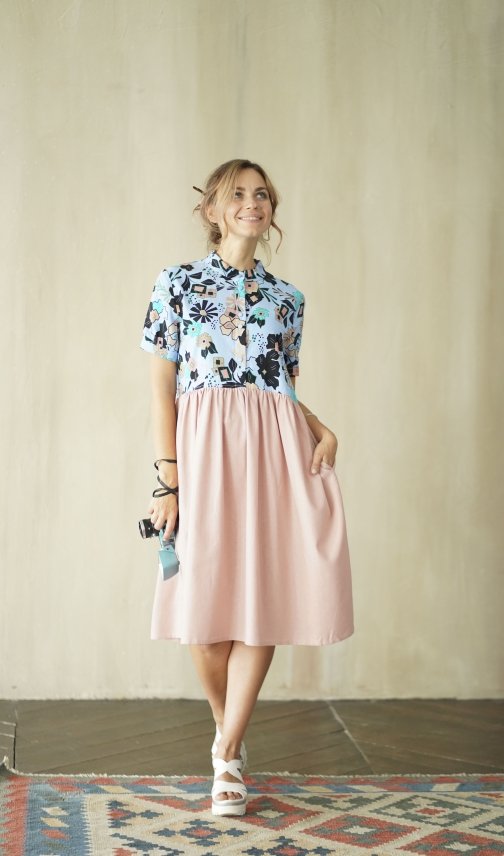 Прекрасное льняное платье - верх голубой с принтом, низ пудрово-розовый.