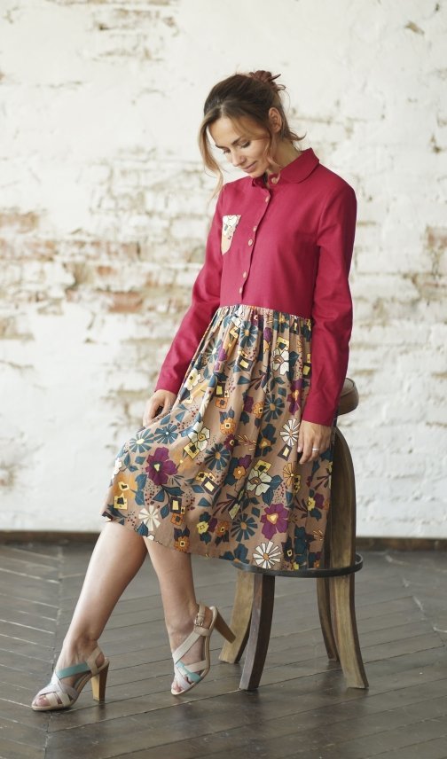Платье из льна. Верх масала (тёмно-красный), низ "кофе с молоком" с принтом.
