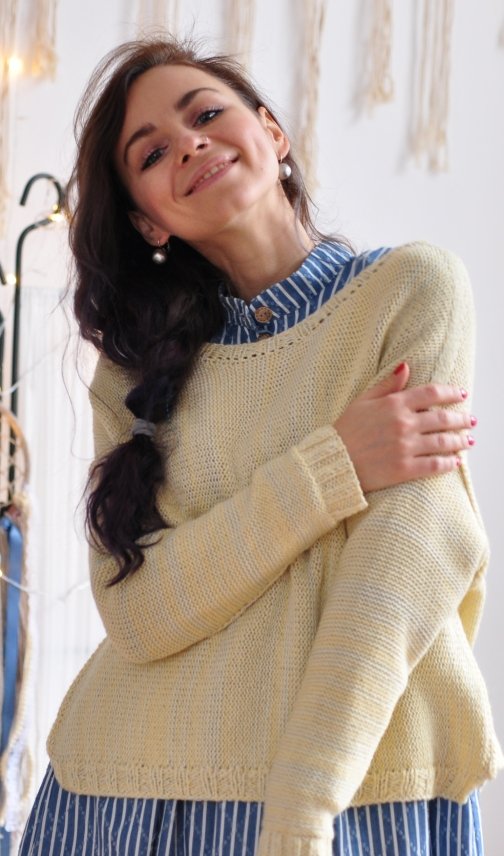 Нежно жёлтый воздушный свитер без единого шва, связанный по уникальной технологии на японской вязальной машине нашим отечественным дизайнером в Москве! Такого нет ни у кого! :)