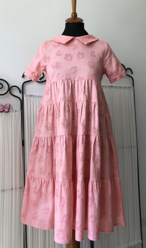 Летящее платье из розового жаккарда (хлопка) с рельефными розочками.